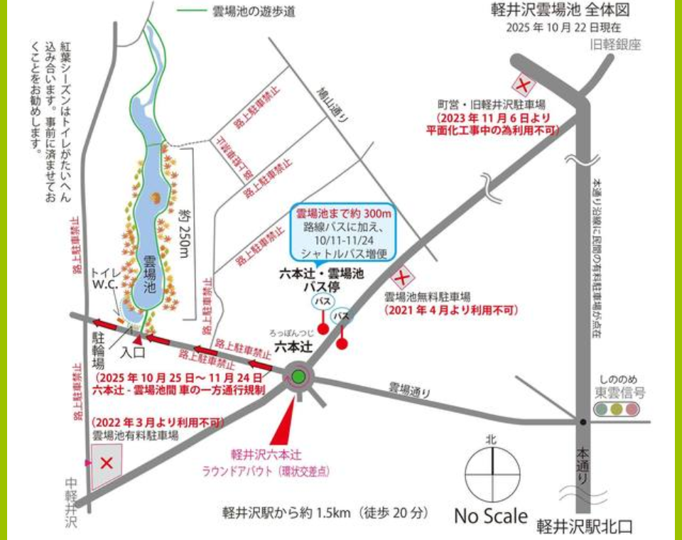 赤字を見るとわかる通り、雲場池の駐車場は軒並み利用不可、路上駐車は親の仇が如く禁止していた。