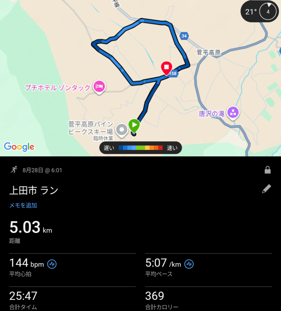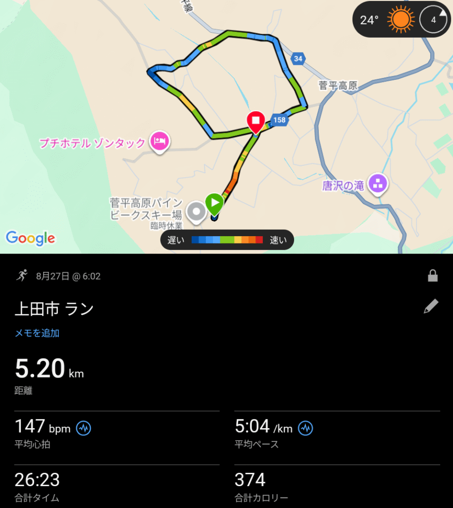 はずだったが、帰り、なぜか送迎のバスではなくジョグで帰る目になり(自主性)、3キロと少しを走って宿舎に戻った。