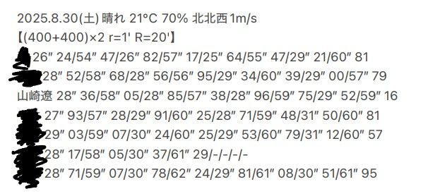 400m一本ごとのレストは60秒、セット間は20分。設定は個人の裁量によるが、俺の場合1本目の400は58〜59″、2本目を55〜56″まで上げるつもりだった。