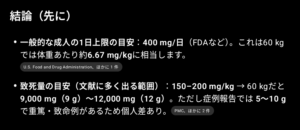 ここで、俺のオーバードーズを疑って心配してくれる読者のため、というか念のため、致死量等も記しておく。