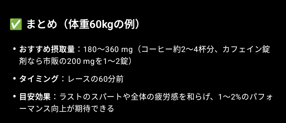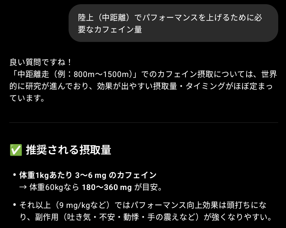 それはひとえに、メニューでのパフォーマンスを向上させるためである。一般的に、陸上競技(ここでは中距離について)でパフォーマンスを向上させるために必要なカフェイン量は3〜6mg/kg(体重)とされている。