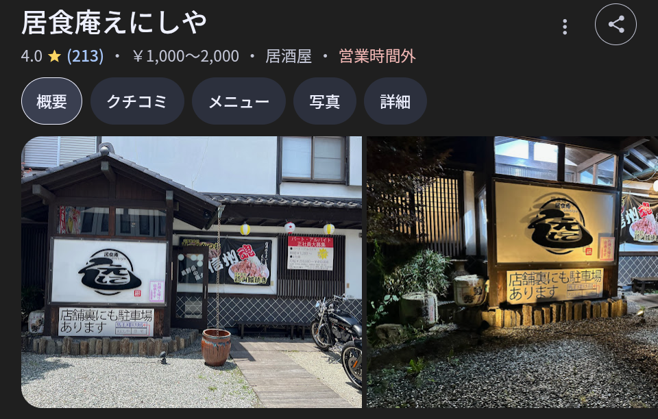 疲れた身体を温泉で癒やした我々は、夕食を求めて動き出した。向かったのは「居食庵えにしや」