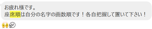 午後の活動量はたかが知れているものの、それでもお腹は減っていた。なお、皆さんお待ちかねの席順は以下の通りである。